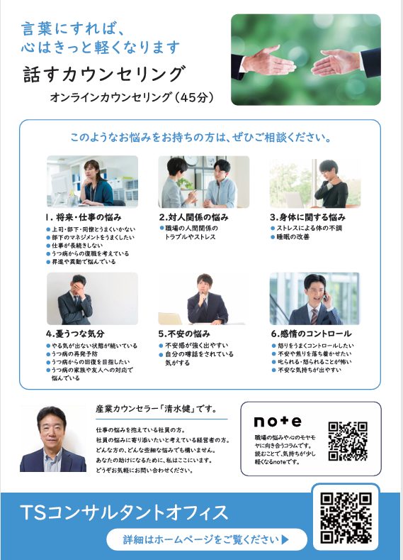 イベント パンフレットのご案内 2026.01.20 2026.01.21 TSコンサルタントオフィスのパンフレットを更新しました。 記事のタイトルとURLをコピーする Post Share Line note カウンセリング会社cotree様の紹介ページに登録いただきました 前の記事 書籍のご案内 次の記事